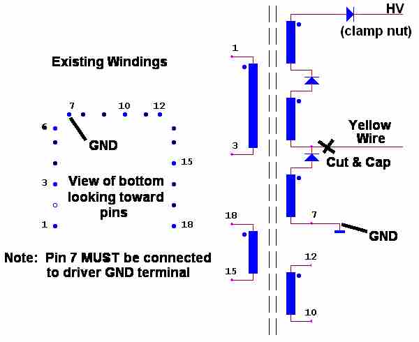 In the examples below the supply is 12V DC and the primary winding is 3+3 turns (centre tapped) on the bare limb of the flyback.